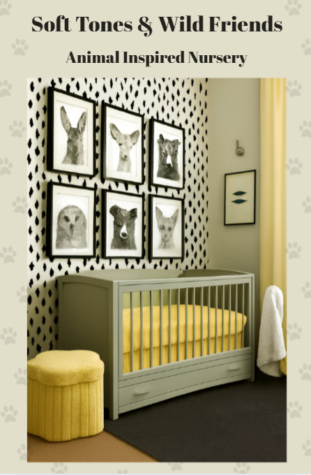 Create a cozy, playful vibe with this animal-inspired nursery featuring soft tones and bold accents. The black-and-white wallpaper and framed wild friends add charm and character, while pops of yellow bring warmth and energy. Shop the look below to recreate this sweet space—