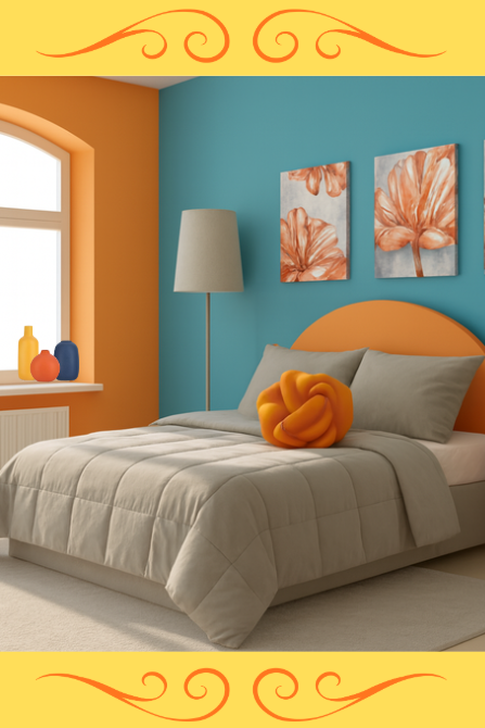 Bold orange and turquoise walls frame a cozy bed dressed in soft gray bedding and an eye-catching knot pillow. Floral canvas art and minimalist accents complete this vibrant, modern retreat.