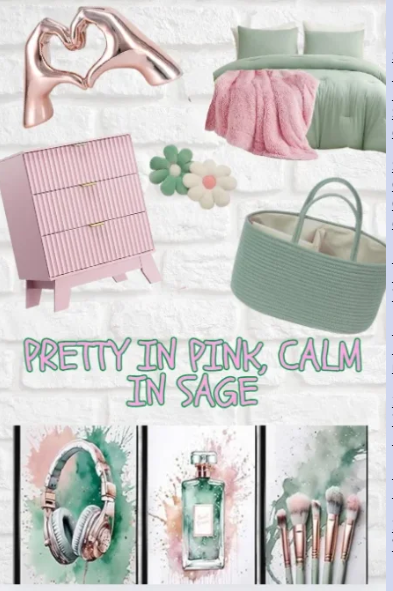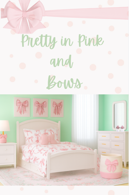 A pastel mint green bedroom featuring a white bed with pink bow bedding, a floral rug, white furniture with gold handles, sheer white curtains, a pink bow lamp, and elegant satin bow wall art. Cozy, cheerful, and perfectly coordinated